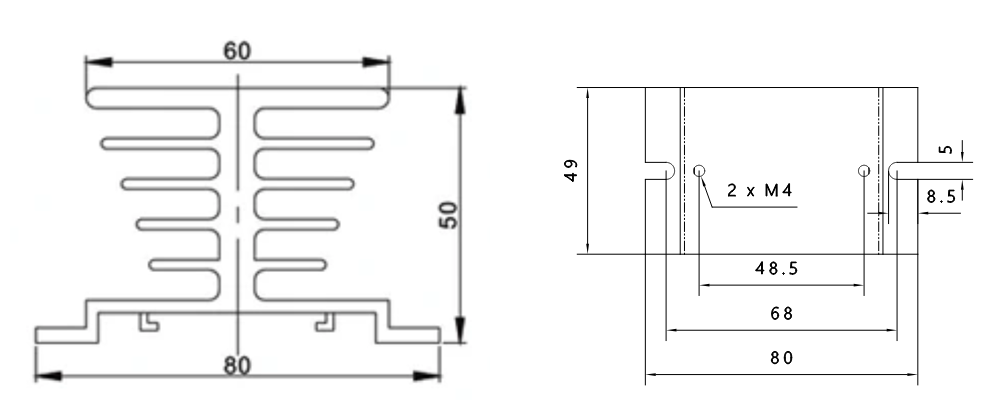 dolna podstawa: 80 x 50mm górna podstawa: 60 x 50mm szerokość między otworami do montażu przekaźnika: 48mm |